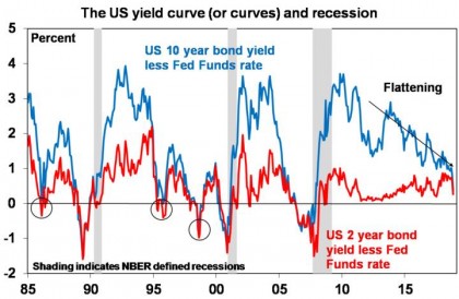 Monetary conditions are still not tight in the US and they are still very easy globally. While there has been much fretting about the US yield curve flattening and in some cases inverting (with long term bond yields falling below short-term interest rates) the two yield curves we have found most reliable are still positive albeit less so. The gap between the 10-year bond yield and the Fed Funds rate has flattened dramatically but is still positive at 39 basis points. And the gap between 2-year bond yields and the Fed Funds rate has also flattened a lot but is still positive. As can be seen in the next chart, prior to the last three US recessions both of these yield curves inverted – but there were several false signals and the gap between the initial inversion and recession can be around 15 months. So even if they both invert now recession may not occur until 2020 and yet historically share markets only precede recessions by around 3-6 months so it would be too far away for markets to anticipate. And past recessions in the US have also been preceded by the Fed Funds rate being well above inflation and nominal growth and it’s a long way from that.